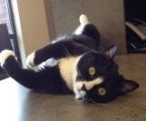 Stanley came to us after eating a couple of nerf darts and a lego piece… again. Yes, he is a second offender of eating undigestable materials. Unfortunately, his original owners just couldn’t afford his sense of taste, and therefore was bequeathed to us. After 2 hours of surgery, and 8 inches of intestinal tract removed, the foresaid items were removed. He now lives in the clinic, and despite all of the precautions he still tries to eat anything smaller than his head. It’s a good thing that we love him. You will see him running around, playing, chasing and falling off of things. We think he has trans-species issues and he is a labrador trapped in a cat’s body, which would explain alot of Stanley’s habits. Please forgive him if he attempts to taste you while you are visiting, remember he is part Lab. Best quality is that he melts into a purr bucket when picked up.
